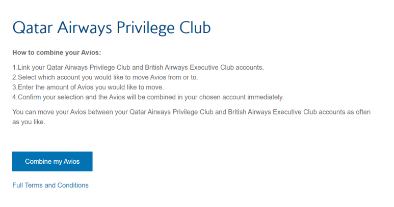 3. Combine my Avios 페이지에서 조금 내려간 뒤, 아래 페이지에서 Combine my Avios 버튼 클릭