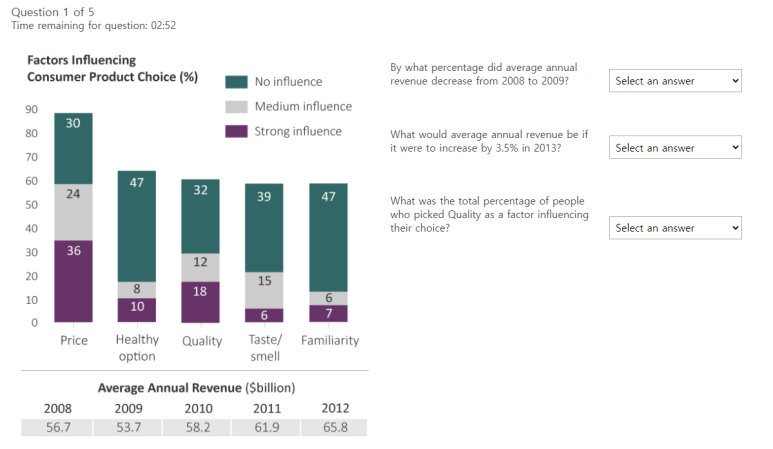 시간은 3분 밖에 안되는데 단어도 어려운게 많아서 번역하는데 시간은 가고.. 그래프는 알아보기 힘들고 패닉와서 계산하는 방법은 기억 안나고 해서 맨 처음 3문제는 선택도 못하고 날렸던 기억이 납니다.