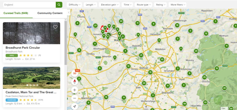 원하는 지역을 입력하면 그 근처의 운동용? 코스를 알려줍니다. Peak district 같은 곳 뿐만 아니라 시티 센터에서 10분 정도 가볍게 산책하기 좋은 코스들도 있습니다.