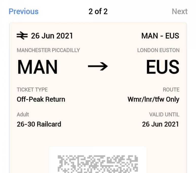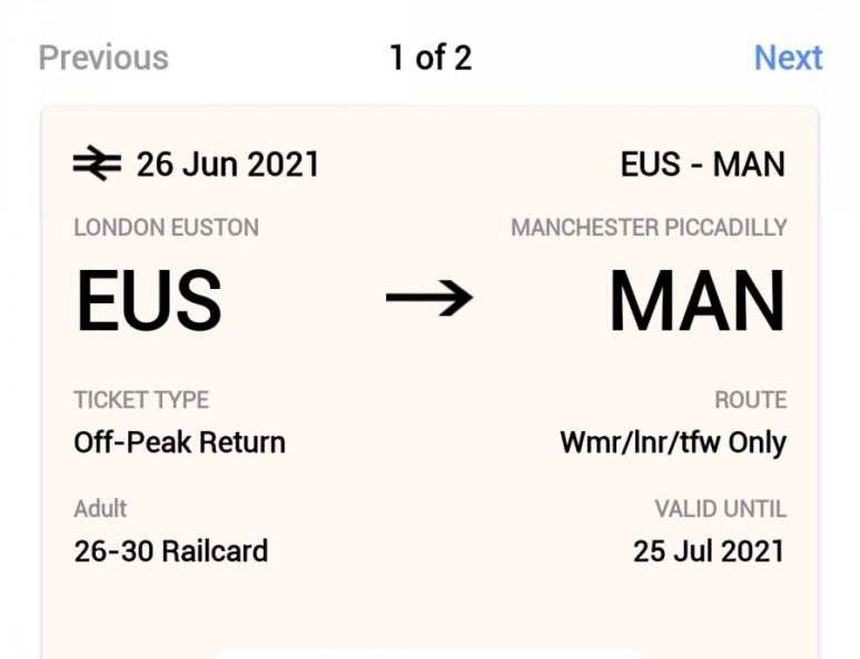 - 예를 들면, 예매 할 때는 맨체스터->런던 오전 10:30 분 기차를 선택하여 예매 했지만 오전 11시 맨체스터->런던 기차도 사용 가능합니다. 아래 사진은 제가 지난 주말 런던을 가기 위해 구매한 티켓인데, 티켓을 보면 날짜만 나와있고 시간이 나와있지 않습니다.