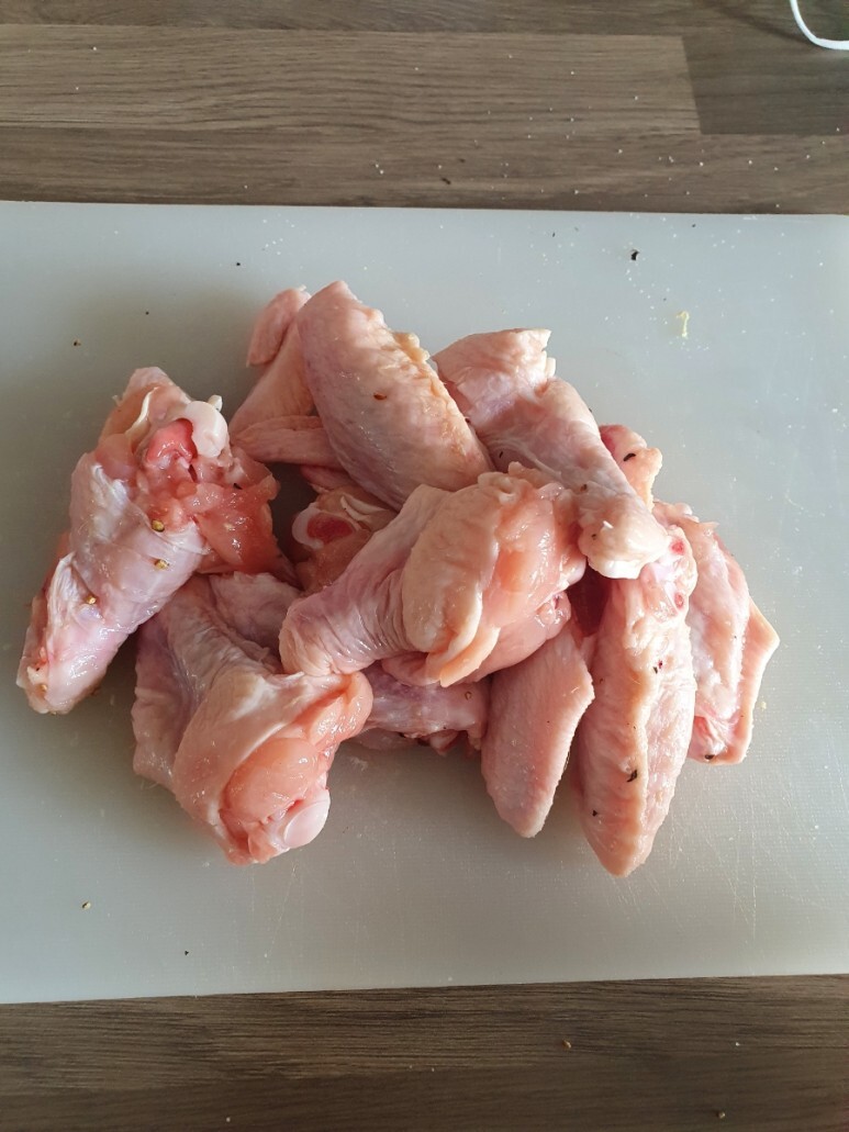 1. 우선 날개를 흐르는 물에 씻은 후 부위별로 잘라 줍니다.