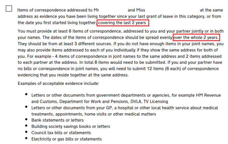 Items of correspondence addressed to Mr and Miss at the same address as evidence you have been living together since your last grant of leave in this category, or from the date you first started living together, covering the last 2 years